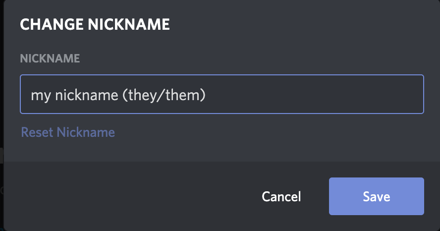 In Discord, you can set a nickname per-”server”. We recommend putting your pronouns in your nickname so they are visible at all times in Discord and with overlays. A few examples of what this would look like: